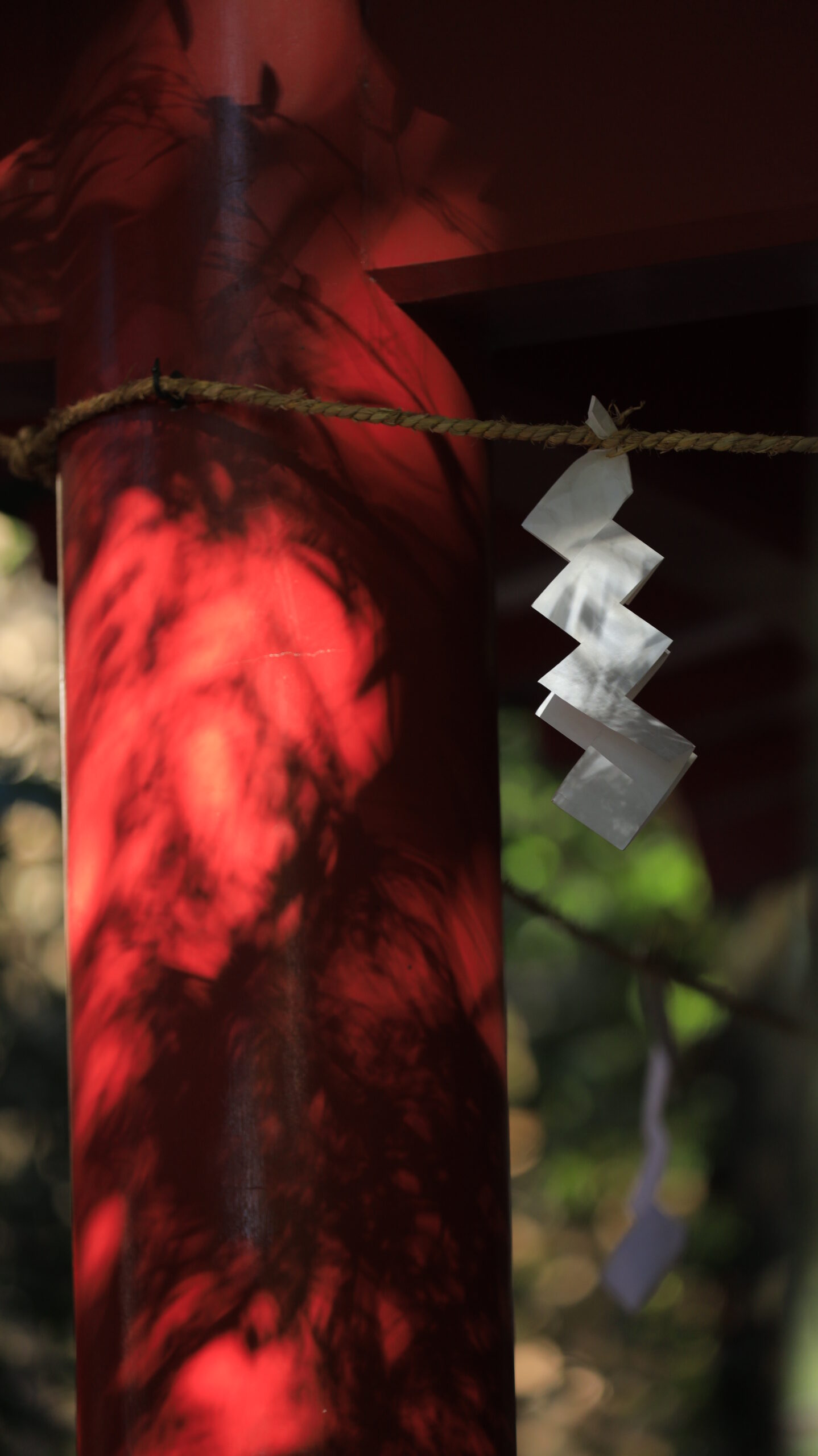 この写真は、来宮神社で、紙垂と鳥居に映る笹の影が作る光景を捉えたものです。