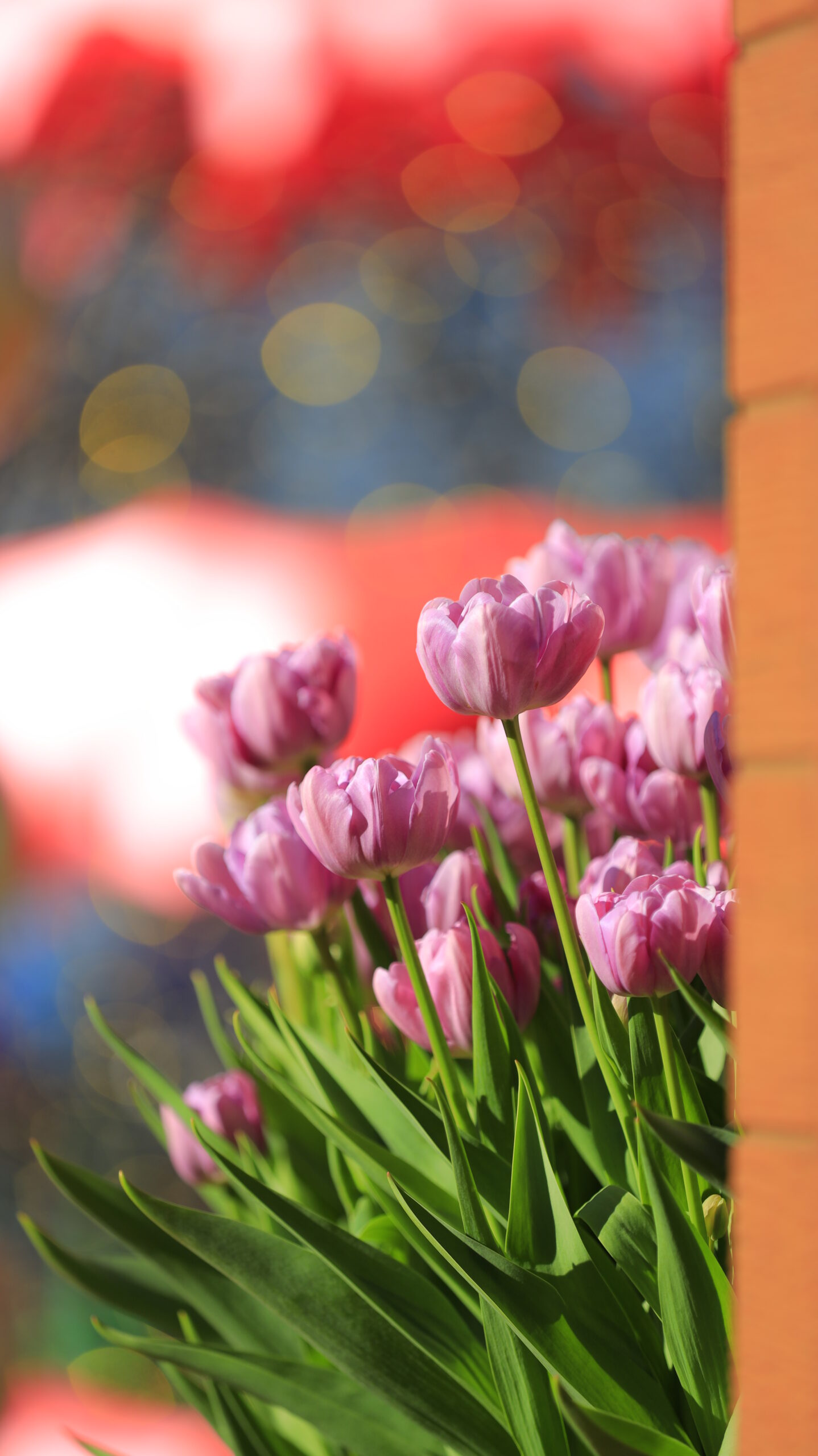 東京ドイツ村で、壁のかだからちょこんと出ているアイスチューリップとイルミネーションの玉ボケの様子を撮影した画像