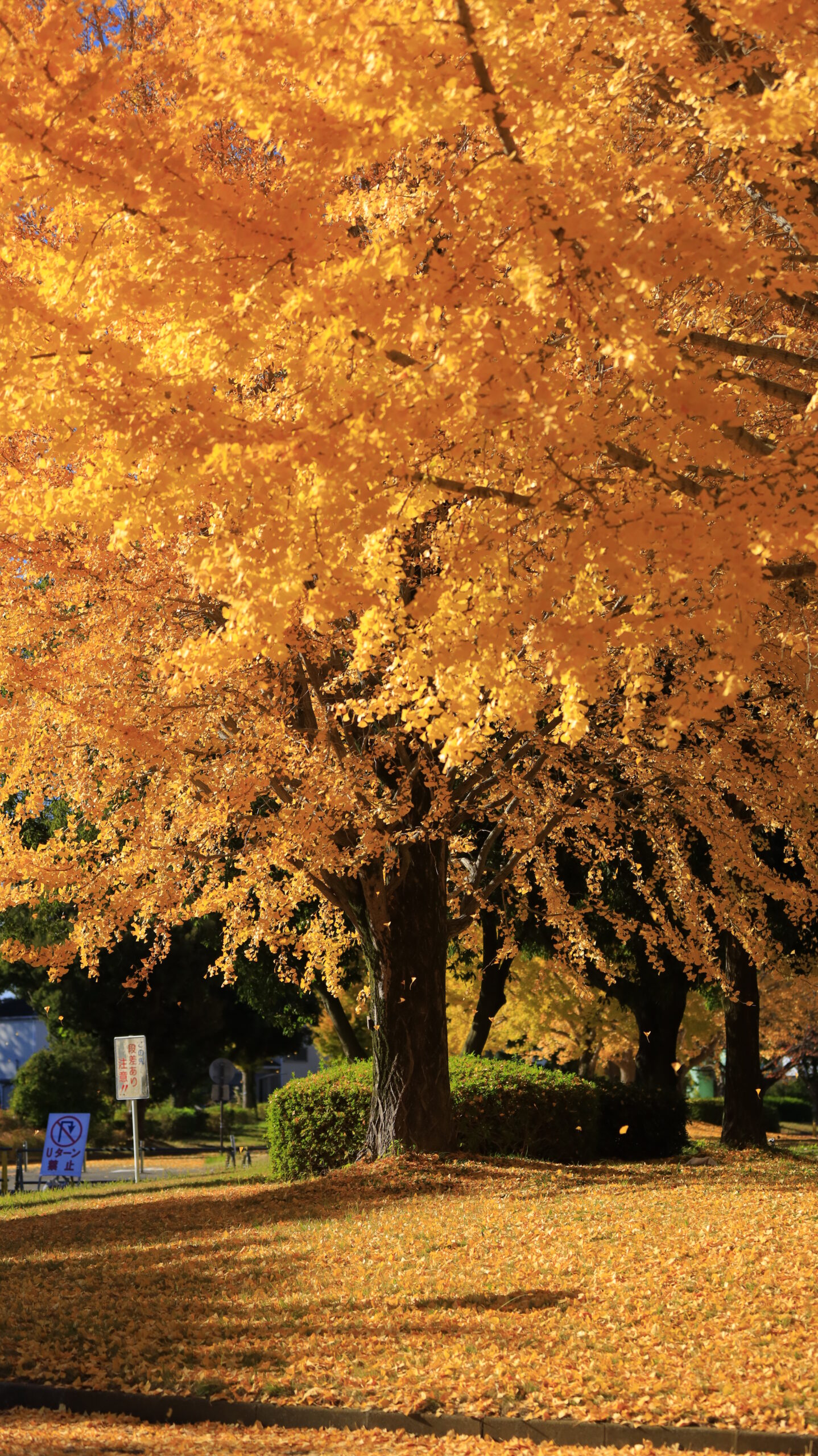 この写真は、川越水上公園で銀杏の木全体と足元の落ち葉の絨毯までを広く捉えたもので、壮大な秋景色を感じられる写真です。