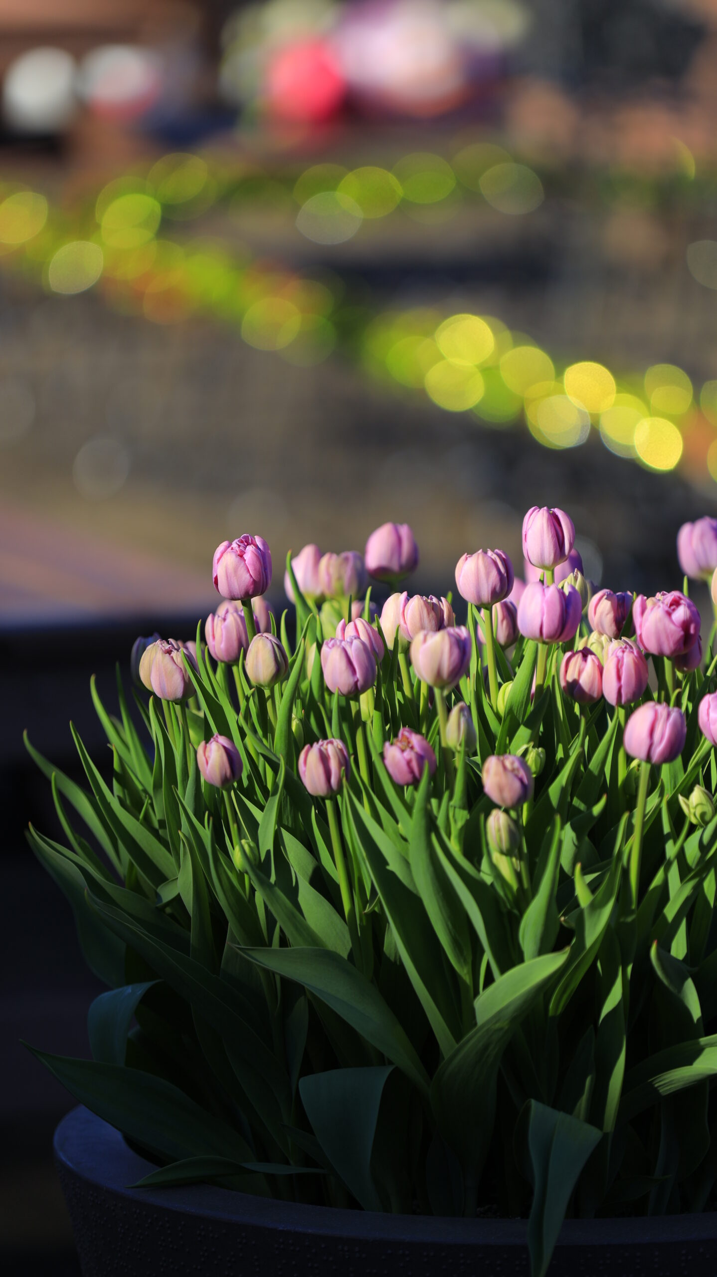 この写真は、東京ドイツ村で、可愛い形のアイスチューリップとイルミネーションの玉ボケの様子を撮影したものです。背景の光を活かして撮っています。