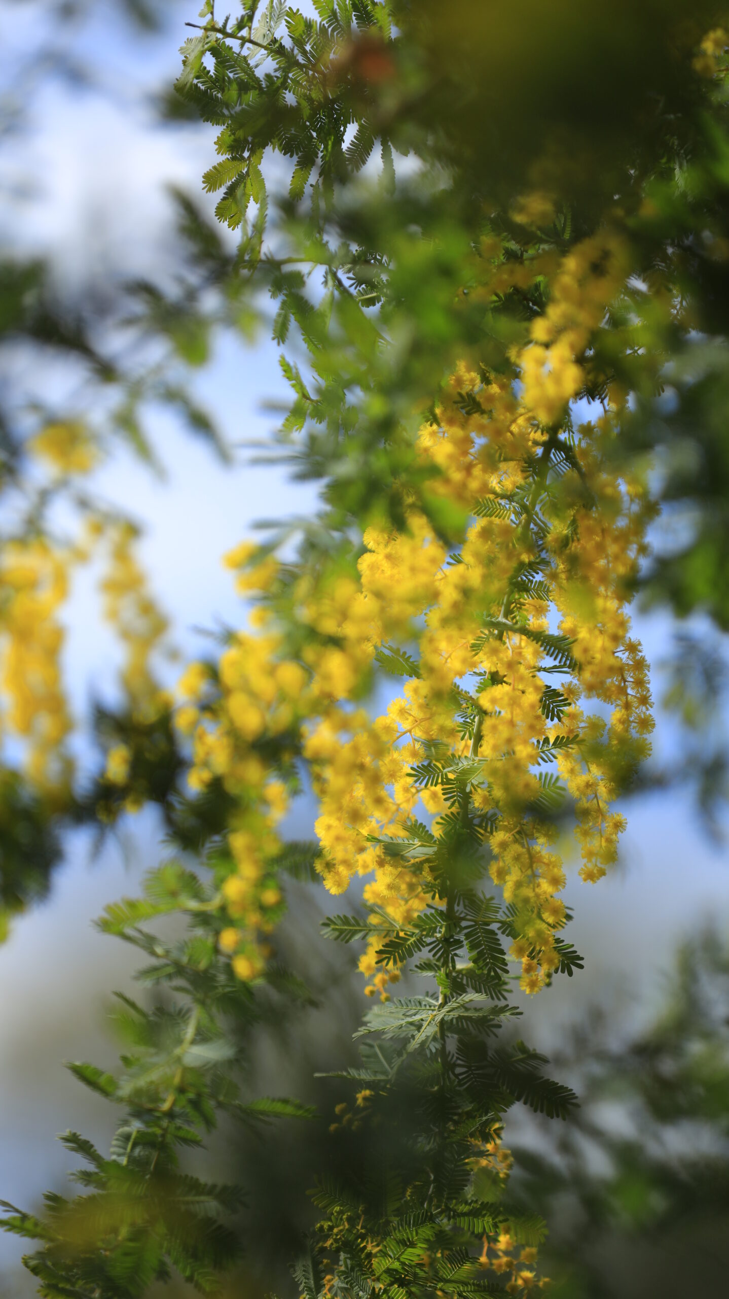 この写真は、中院で、可愛いミモザの花にやわらかな光が当たり、黄色いふわふわした花の質感がいきいきと引き立つ瞬間を切り取った春らしい一枚です。