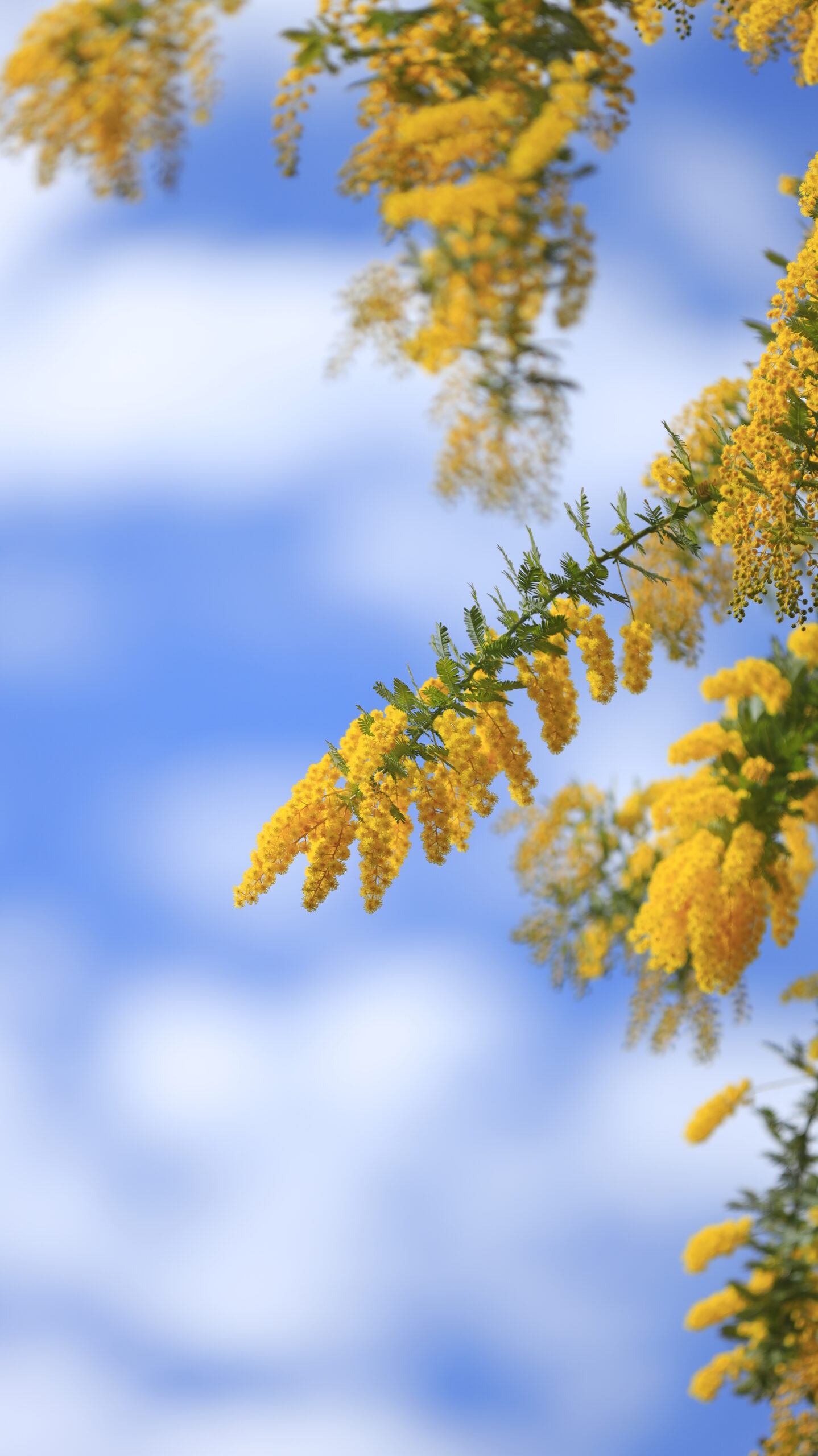 この写真は、中院で、形のいい可愛いミモザの花と空を意識して撮影し、青空を背景に黄色い花が映える爽やかな春の雰囲気を表現した一枚です。