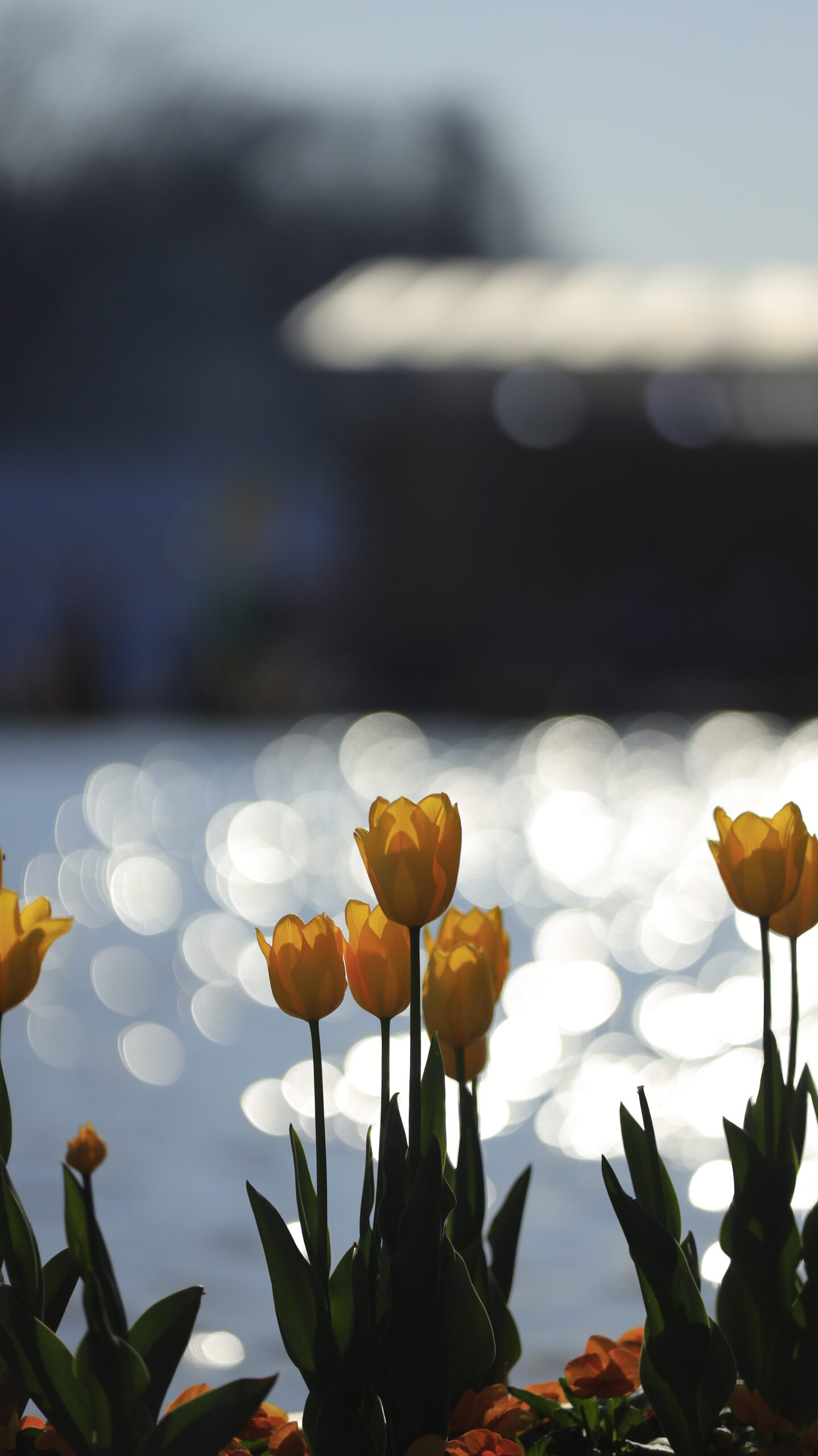 上野恩賜公園で撮影した、黄色のアイスチューリップと池の光を組み合わせた一枚。