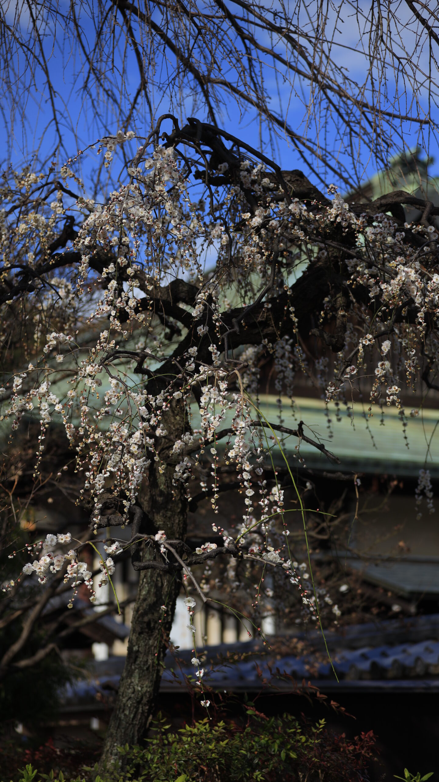 喜多院で枝垂れ梅と奥に見える寺院の建物を撮影した、歴史ある境内と梅の花が調和する景色