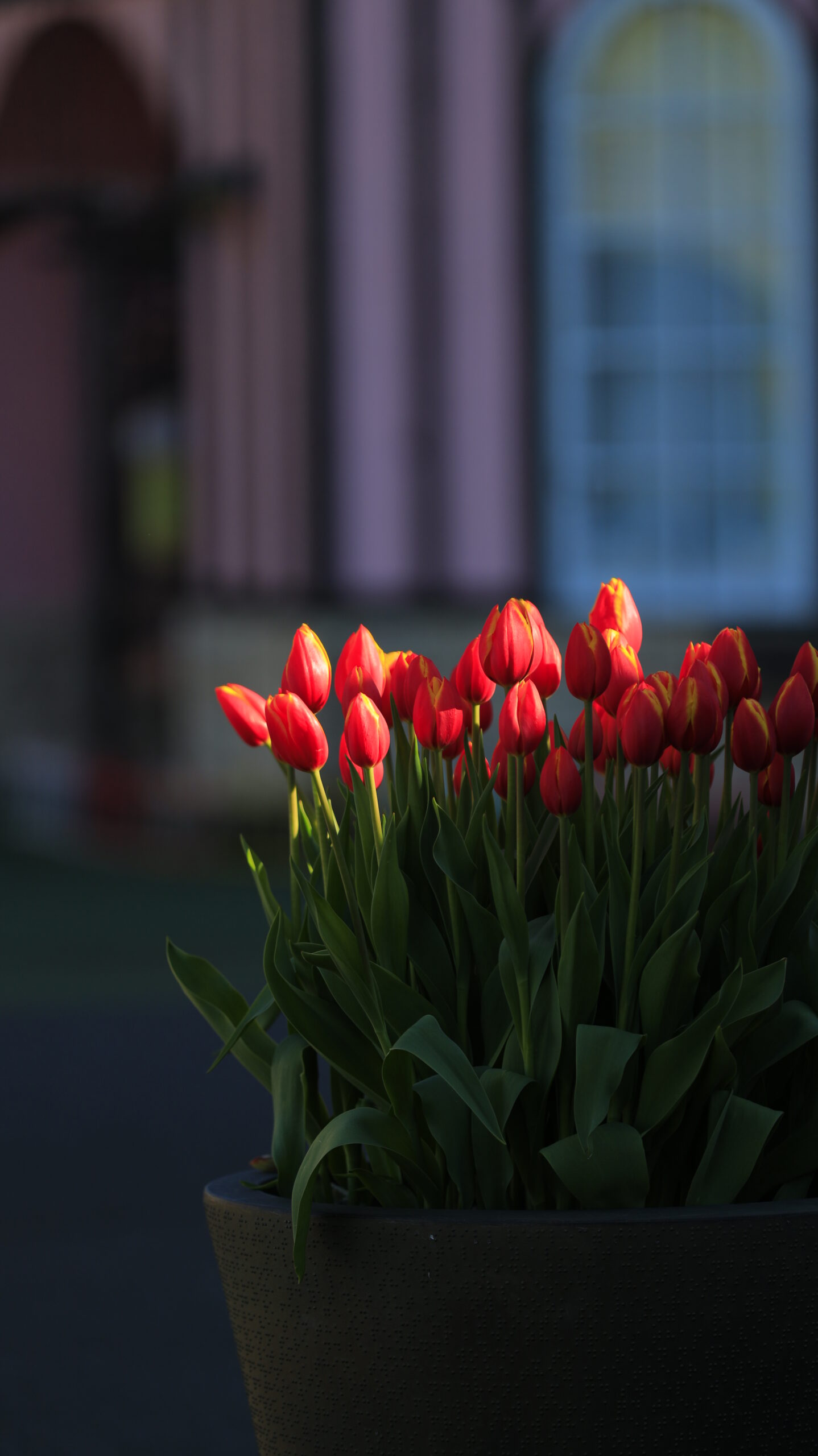 この写真は、東京ドイツ村で、赤のアイスチューリップの花の一部に光が当たる様子を撮影したものです。光で花の表情が変わる瞬間です。