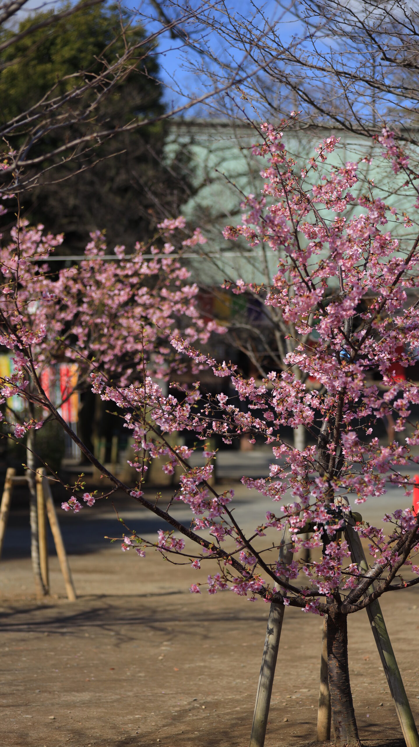 この写真は、喜多院で、奥の建物と河津桜の様子を組み合わせて撮影し、桜色のボリューム感と境内の奥行きが伝わるように構図を整えた写真です。
