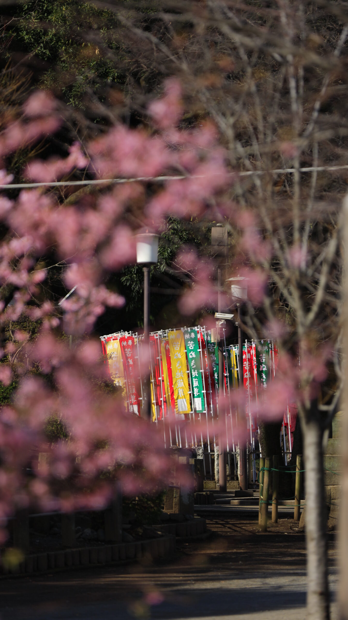 喜多院で河津桜の隙間から旗を撮影した、花越しに境内の雰囲気を感じられる印象的な風景