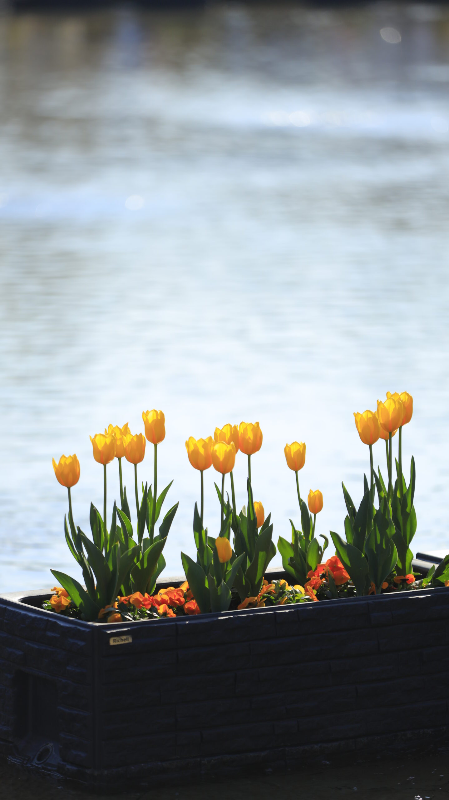 この写真は、上野恩賜公園で、明るめに斜め上から黄色のチューリップと池を撮影したものです。