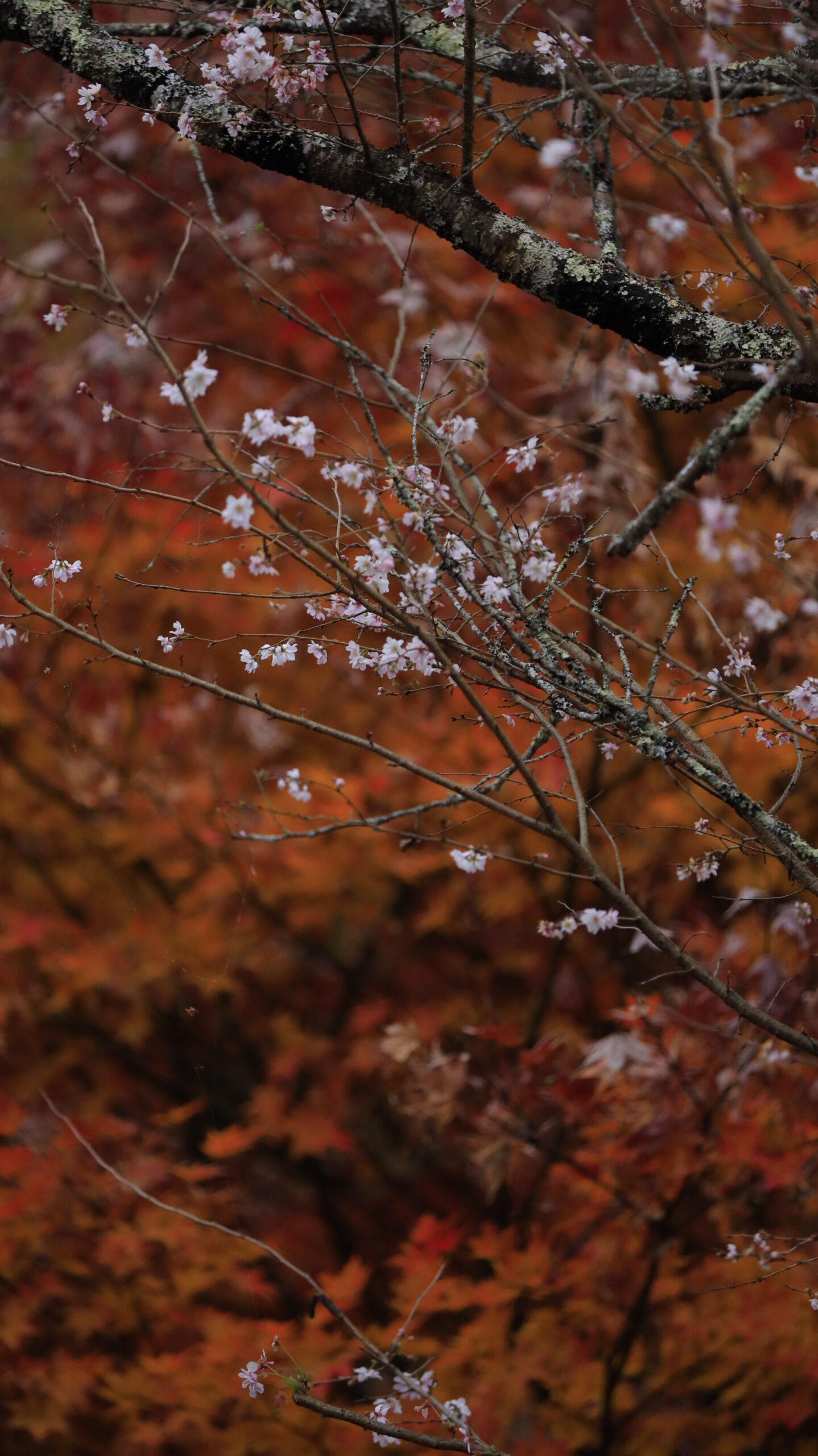 この写真は、城峯公園でオレンジ色の紅葉を背景に冬桜を撮影したもので、温かみのある紅葉と淡い桜色の対比が美しく映える一枚です。