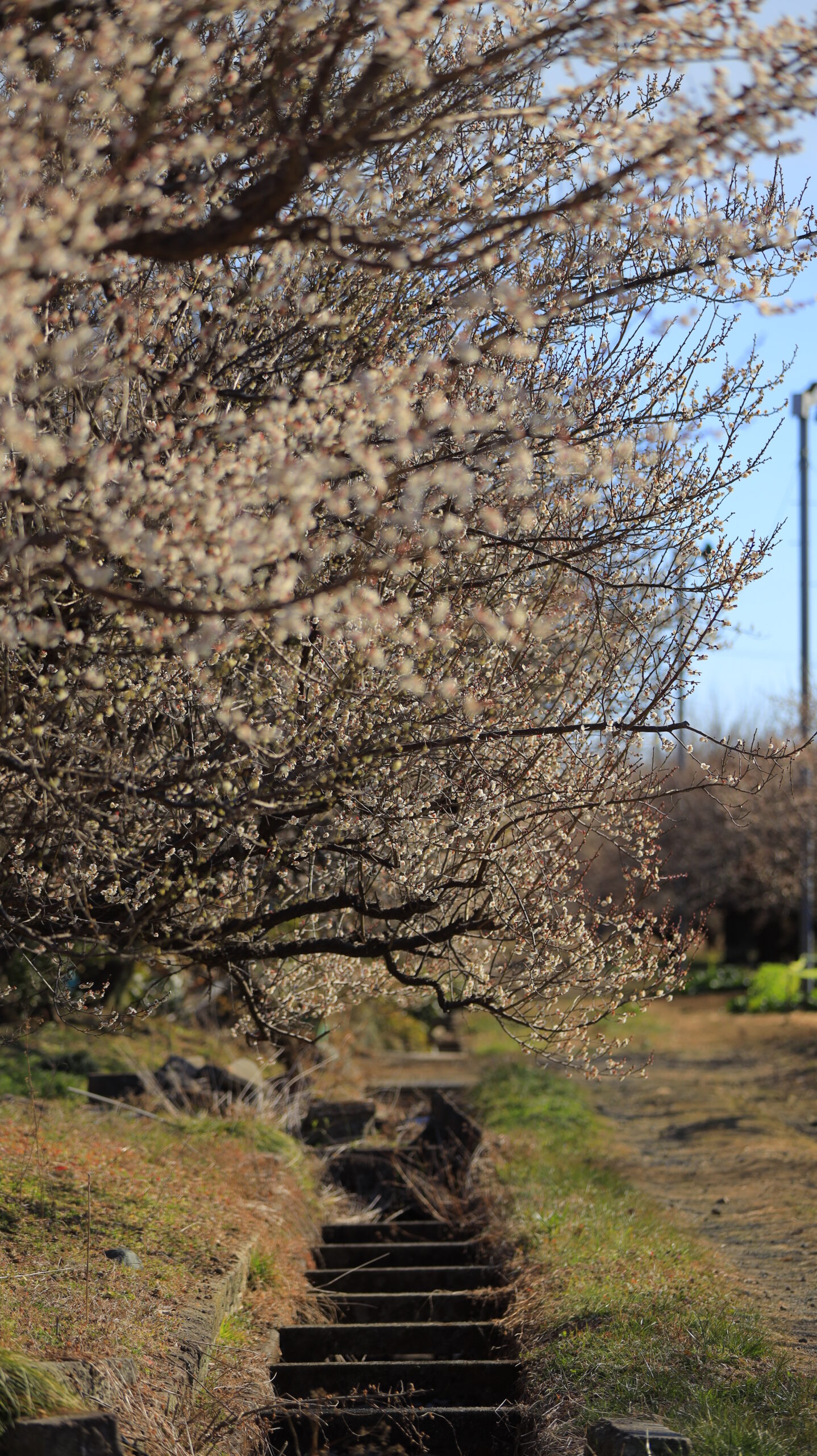 曽我梅林で、水路を正面に配置し奥の梅の木にピントを合わせて奥行きを表現した写真です。