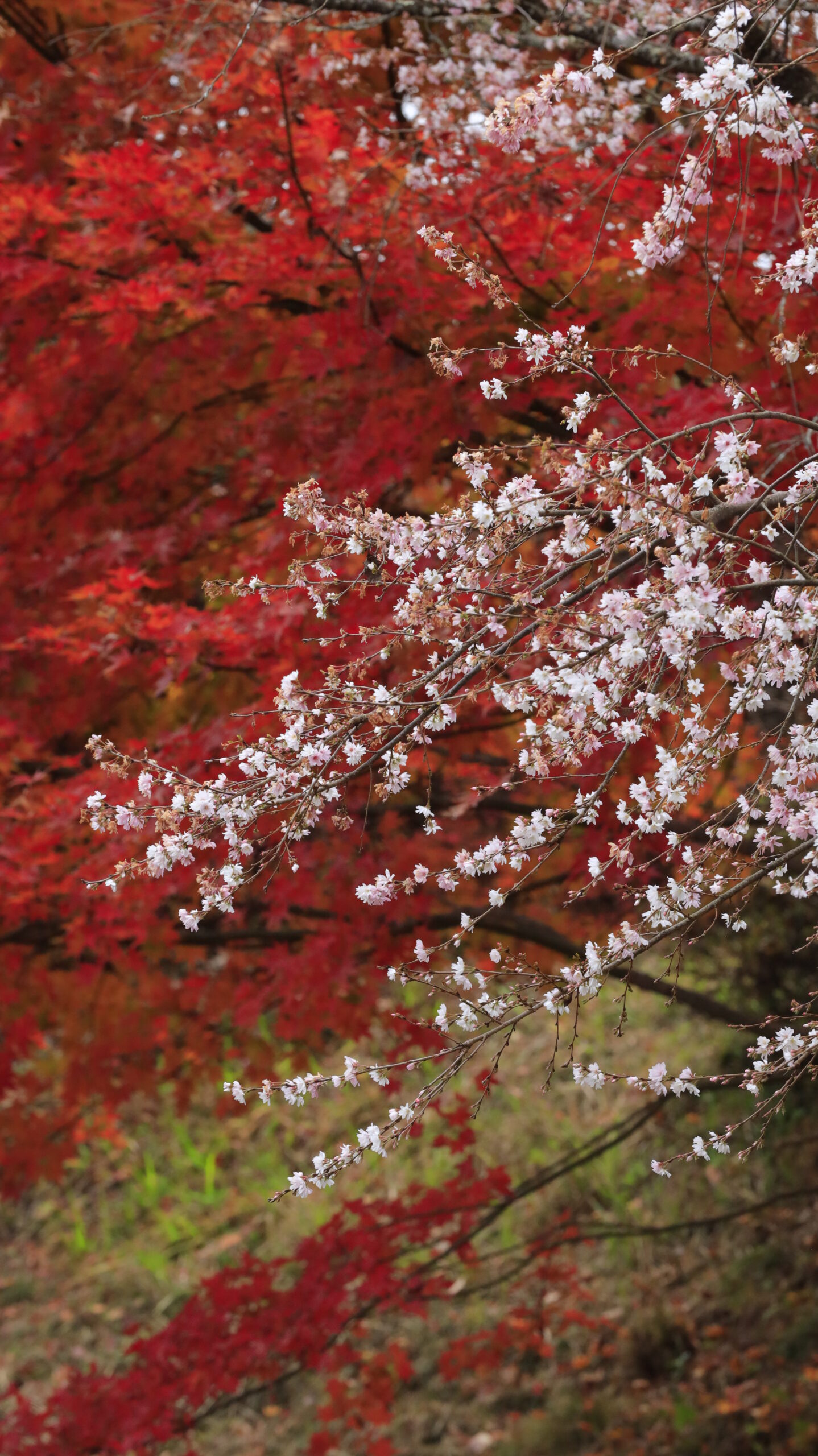 この写真は、城峯公園で冬桜が流れるように咲く様子を、背景のモミジを柔らかくぼかしながら撮影したもので、優雅で穏やかな空気感を表現しています。