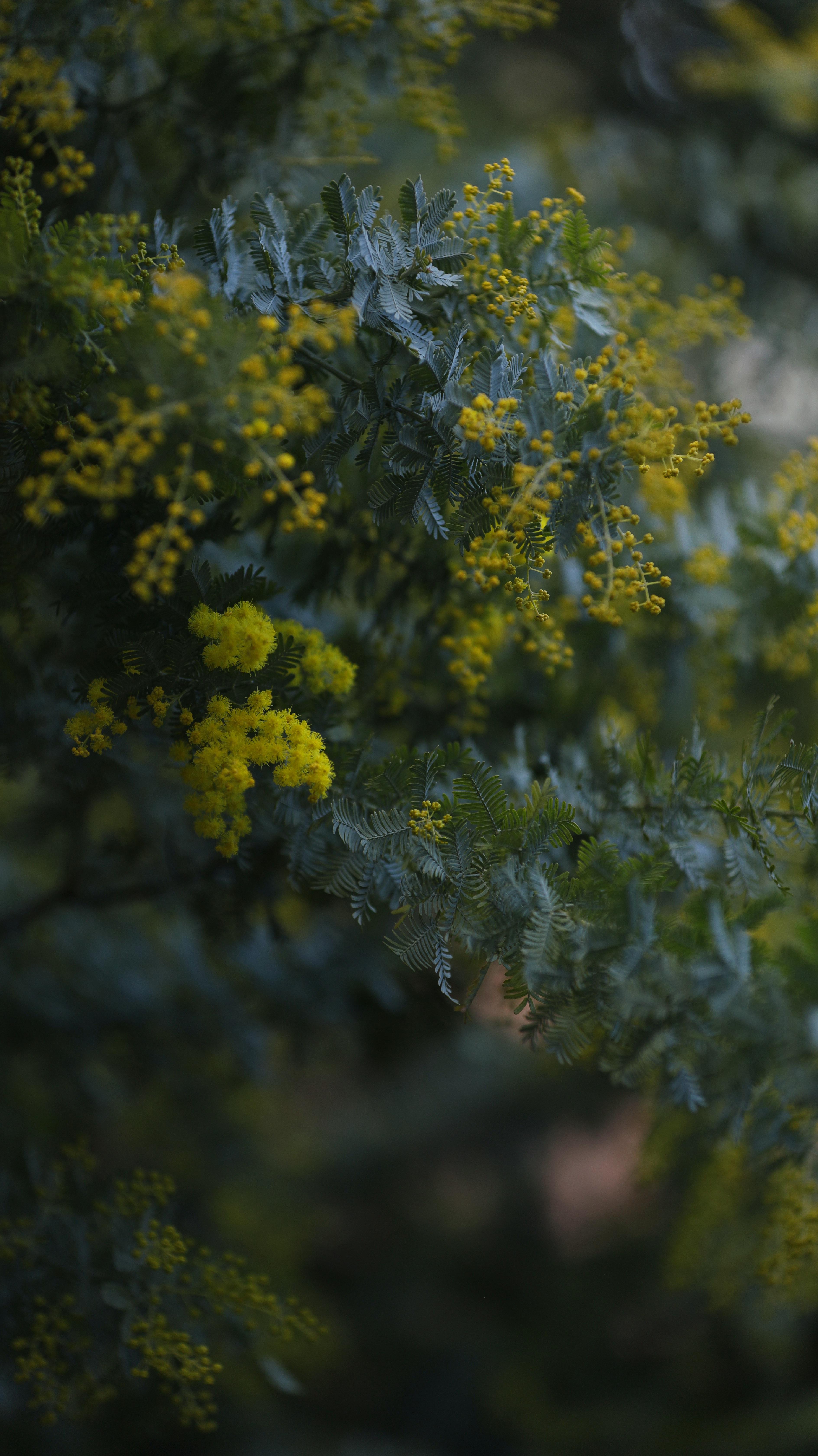 この写真は、午前中の日陰にある暗めの場所で、咲いたばかりのミモザの花を撮影しました。光が限られた環境の中でも、ミモザの鮮やかな黄色が引き立つように構図を工夫しました。満開前の時期だからこそ、蕾と咲き始めた花の繊細な対比が楽しめます。境内の落ち着いた空気の中で、優しい黄色がやわらかく映える光景が魅力的です。