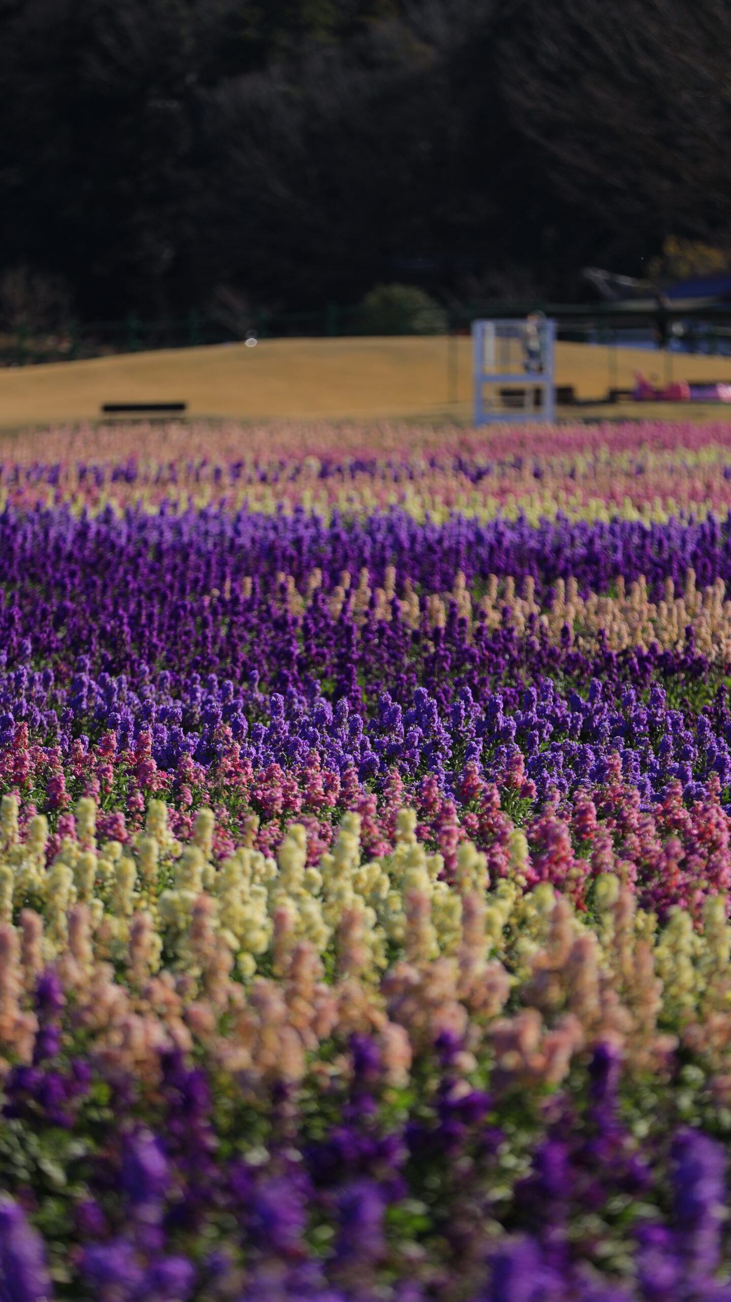 この写真は、東京ドイツ村で、ストック畑の真ん中あたりにピントをあわせて、上下をぼかして撮影したものです。中心の密度が伝わるようにしています。