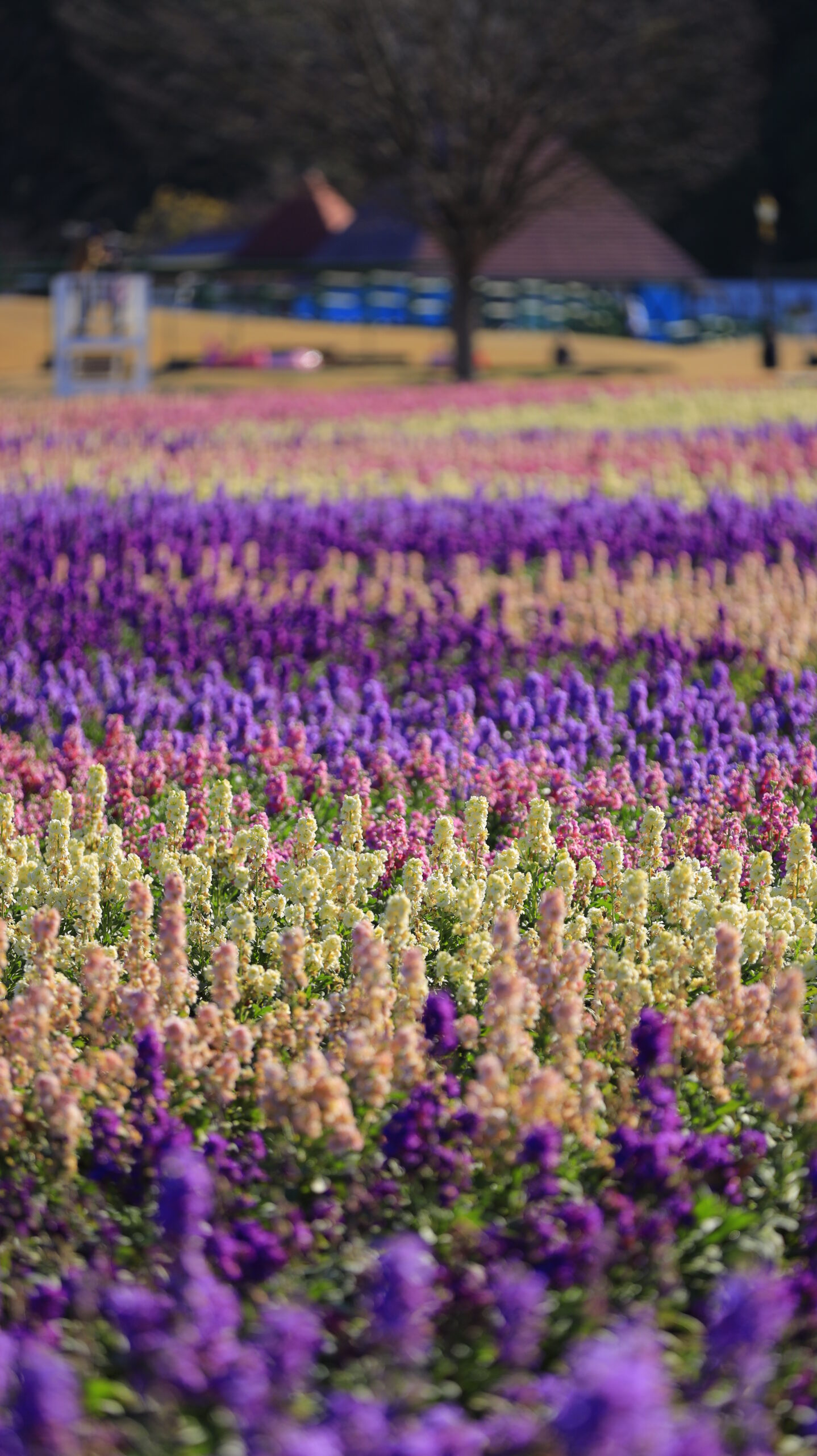 この写真は、東京ドイツ村で、ストック畑のやや手前側にピントをあわせて、後ろ側をぼかして撮影したものです。手前の花を主役にしています。
