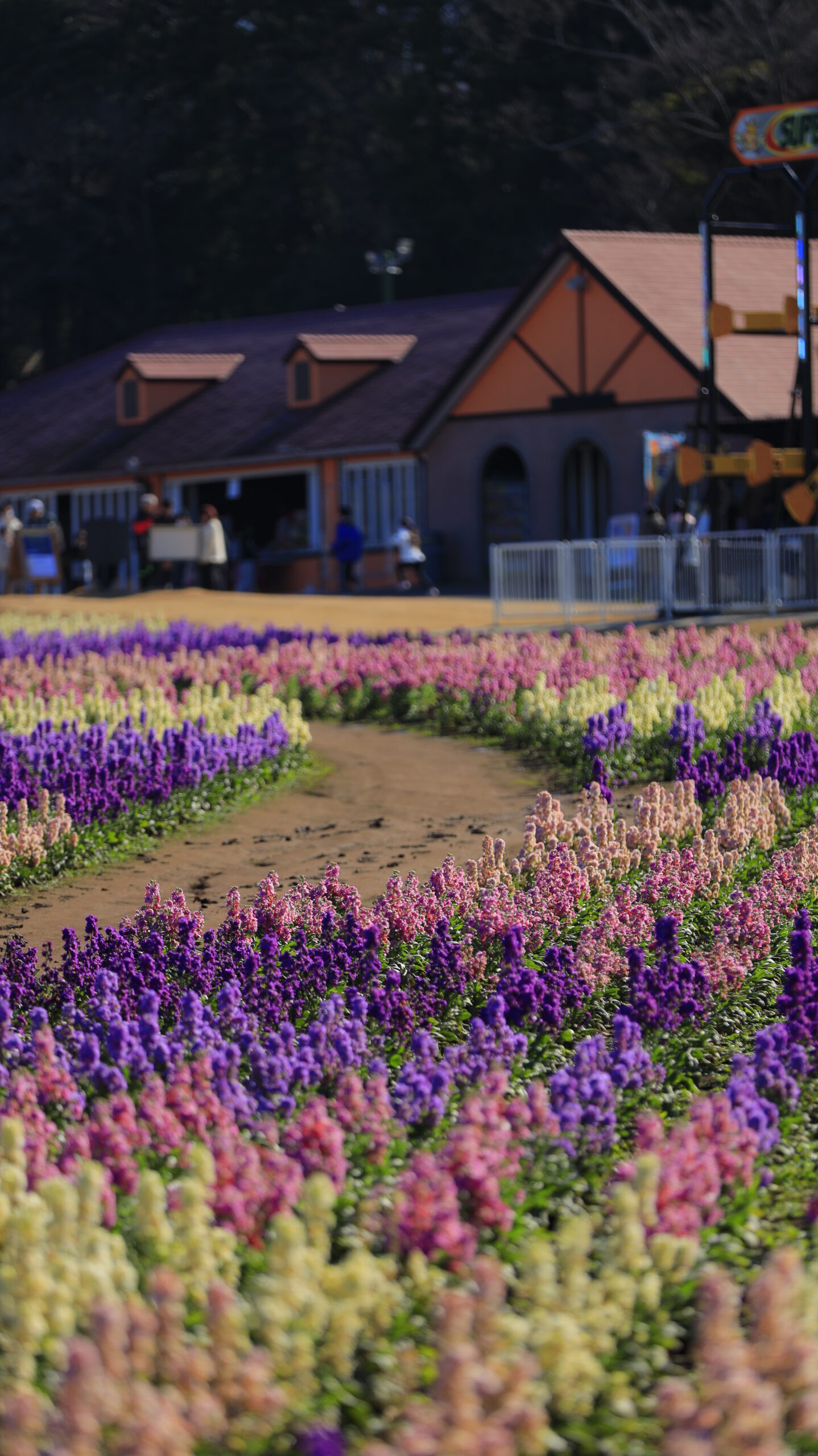 この写真は、東京ドイツ村で、ストック畑の小路を奥行きを意識して撮影したものです。道のラインが印象的になるようにしています。