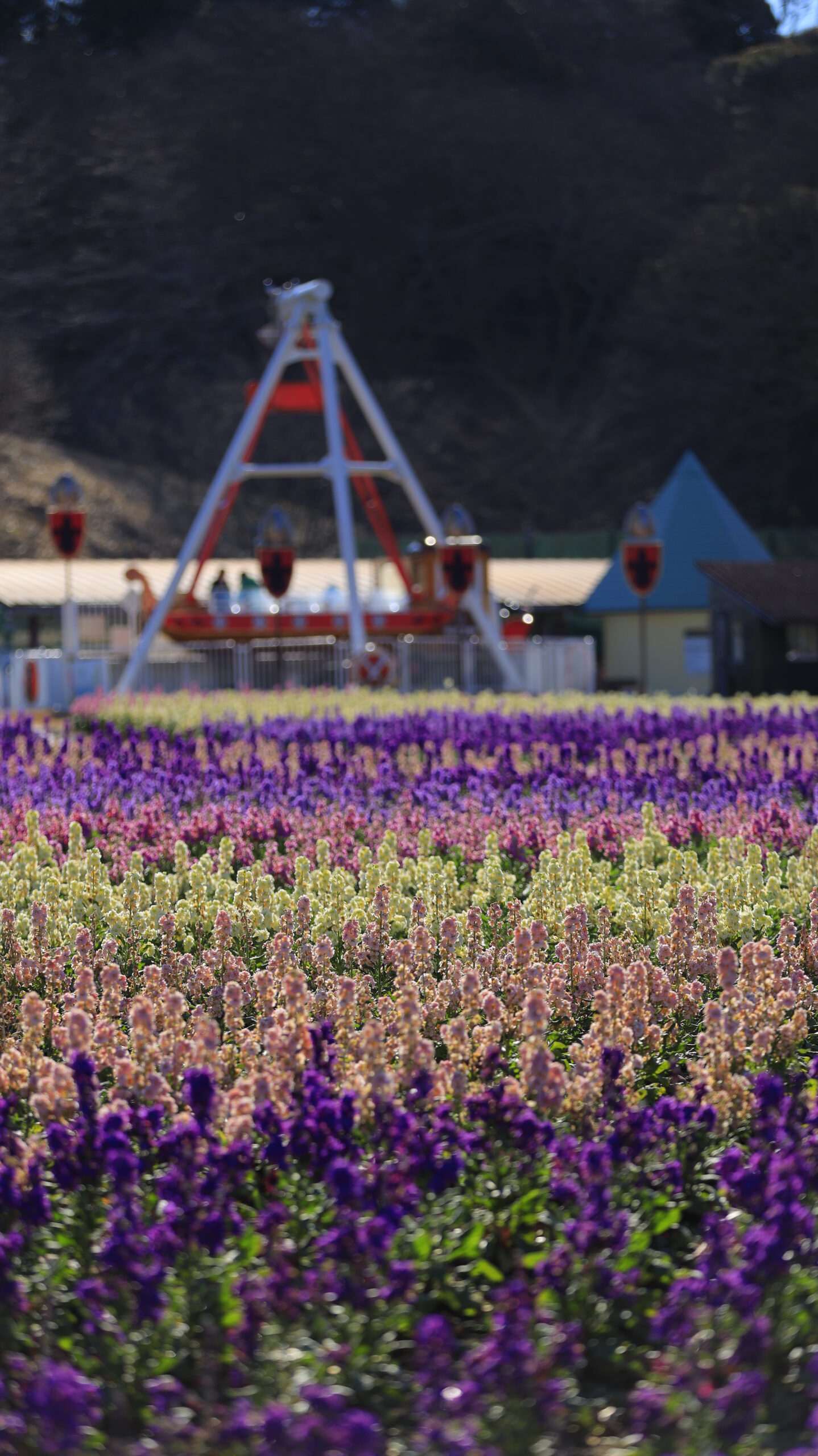 この写真は、東京ドイツ村で、ストックの畑と後ろのバイキングの乗り物を撮影したものです。園内の雰囲気が伝わる組み合わせです。