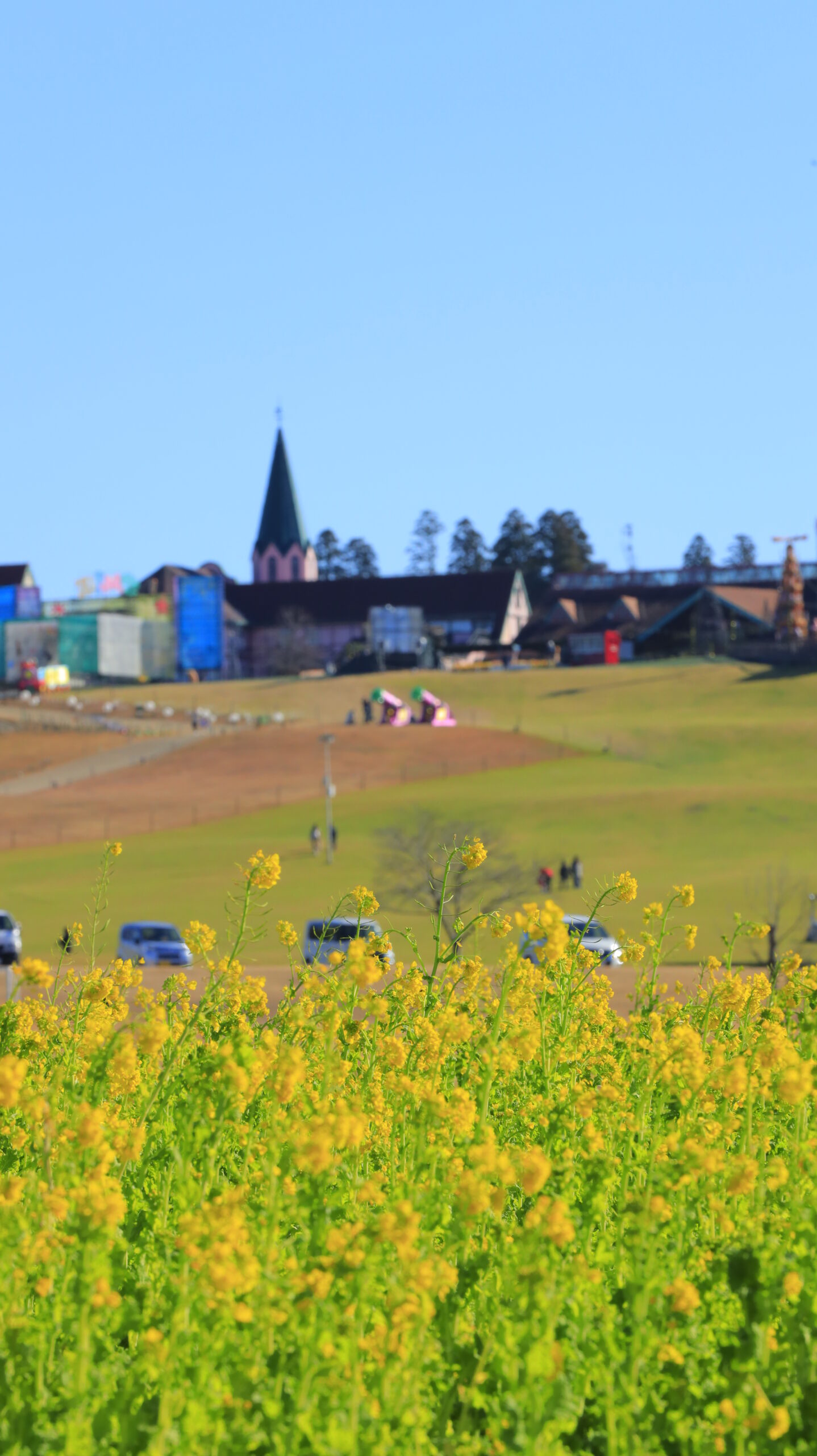 この写真は、東京ドイツ村で、菜の花畑と広っぱと建物の様子を撮影したものです。開けた景色の広がりを意識しています。