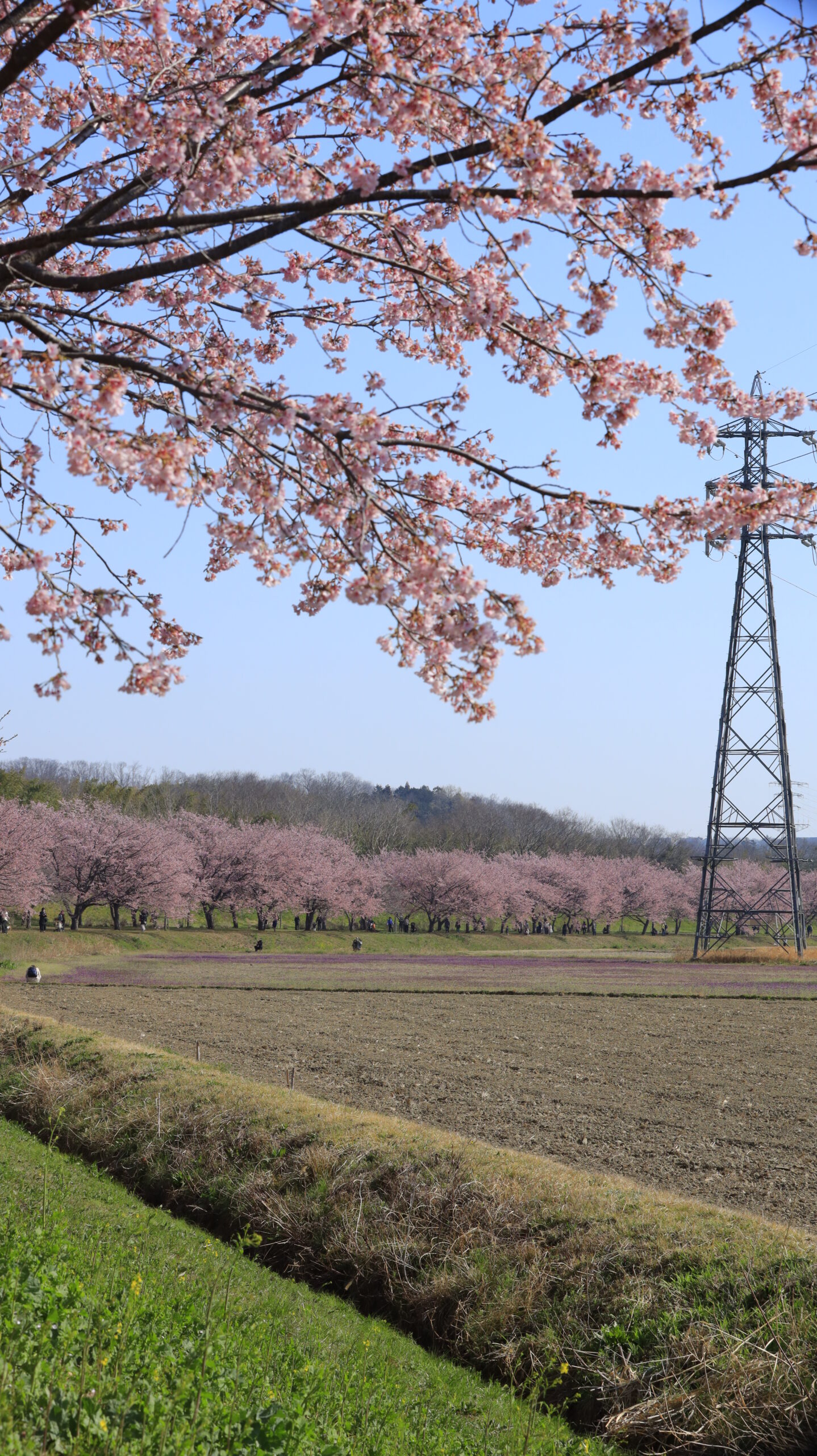 この写真は、北浅羽桜堤公園で、桜並木の奥行きとともに鉄塔を入れ、スケール感を強調して撮影した一枚です。
