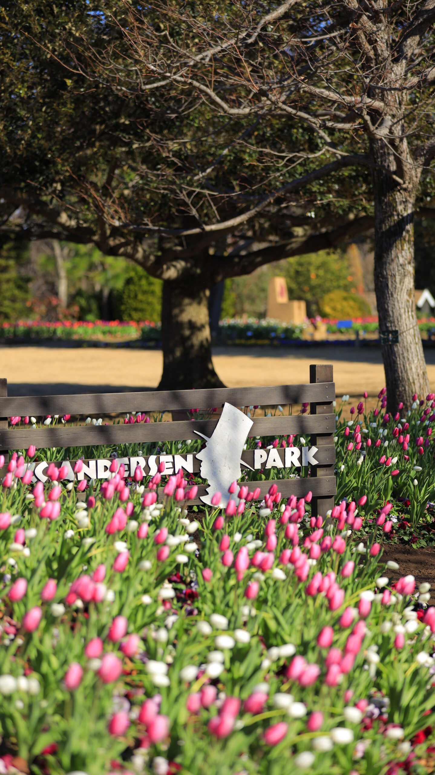 この写真は、ふなばしアンデルセン公園で、アンデルセン公園の看板とアイスチューリップの花を撮影したものです。場所が分かるようにしています。